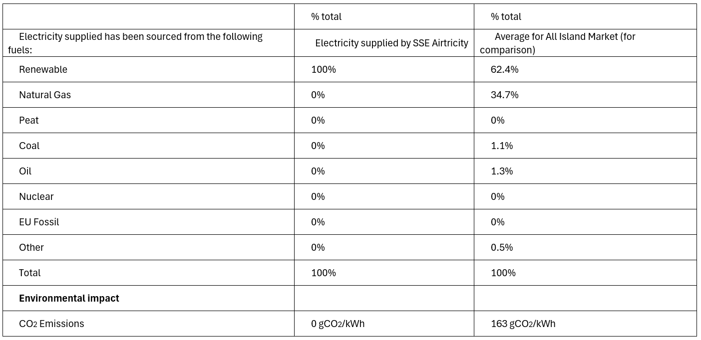 Your specific fuel mix may differ to the fuel mix shown because SSE Airtricity offers green source products. For information on your fuel mix and on the environmental impact of your electricity supply, visit sseairtricity.com or for further details call 0818 40 70 70 (Home Energy) or 0818 81 21 44 (Business Energy).